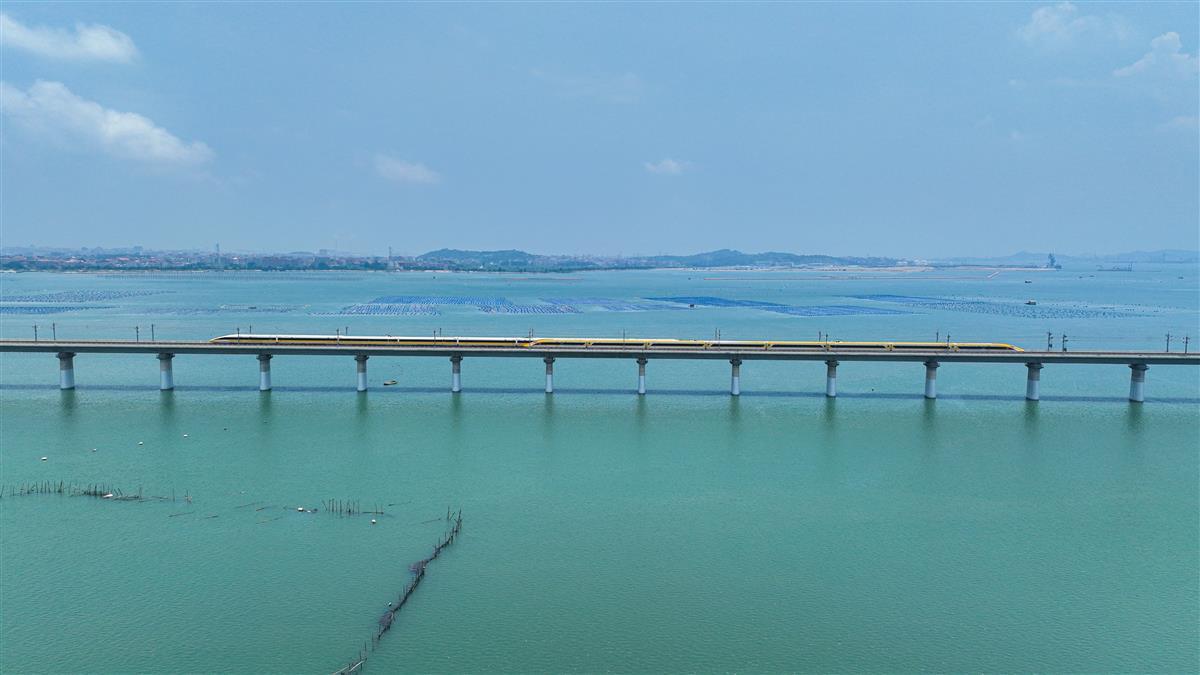试运行列车经过福厦高铁泉州湾跨海大桥