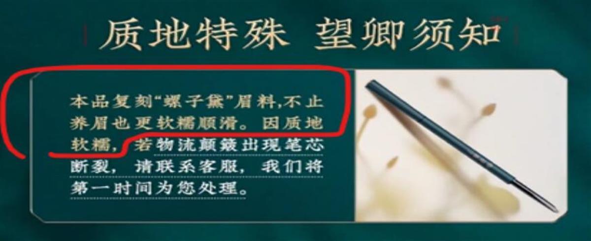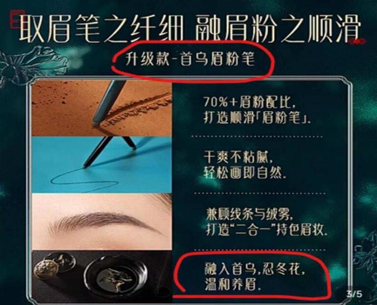 对于王海举报的内容,花西子官方旗舰店客服向极目新闻记者介绍,他们的眉笔遵循相关法规且有备案,产品可放心使用。花西子吸取的是历史中“螺子黛”的典故,将其命名为“螺黛生花眉笔”,从而体现产品对于传统文化的传承,但“螺子黛”并不指代具体原料。该工作人员发给记者的01色号眉笔成分表显示,成分中并无螺子黛,何首乌根提取物排名也靠后,记者进一步询问其眉笔中何首乌根提取物和油脂的百分比是多少,但未收到回复。
