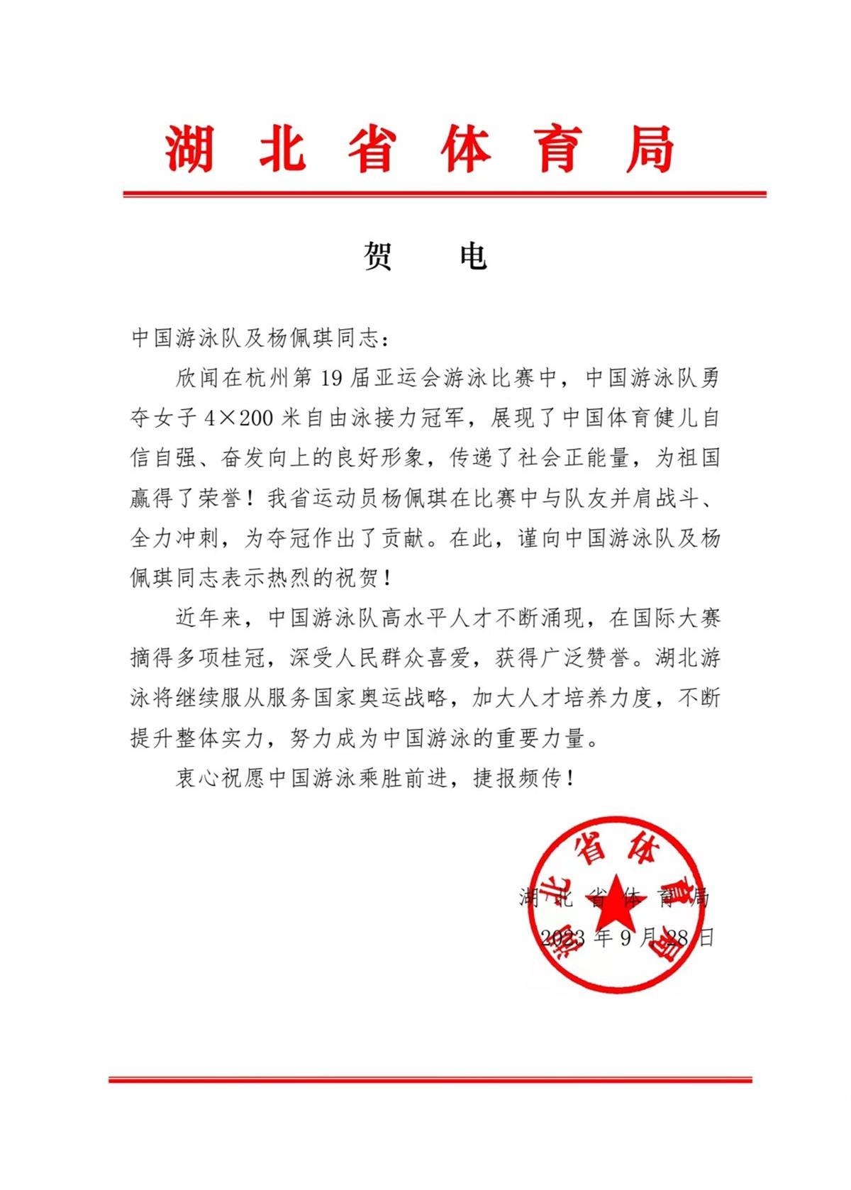 9月28日晚,在杭州亚运会游泳女子4x200米自由泳接力决赛中,中国队以7分49秒34夺得冠军。湖北年龄最小的参赛运动员、年仅16岁的杨佩琪携手国家队队友,在当天上午进行的预赛中表现出色,帮助中国队以8分01秒02排名小组第一,最终以预赛头名的佳绩晋级决赛。按规定,她将分享这枚金牌。