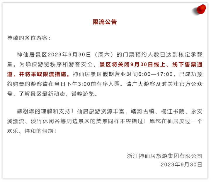 为确保游览秩序和游客安全,景区将关闭9月30日线上、线下售票通道,并将采取限流措施。神仙居景区假期营业时间6:00—17:00,已成功预约购票的游客请在当日下午3:00前有序入园。请广大游客及时关注官方公众号,了解景区最新动态,错峰游览。