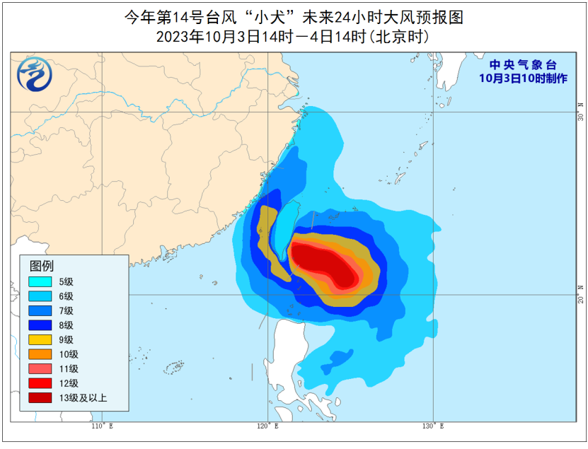 大风预报:3日14时至4日14时,东海南部及钓鱼岛附近海域、台湾以东洋面、巴士海峡、台湾海峡、南海东北部以及浙江沿海、福建沿海、台湾岛沿海将有6-8级大风,台湾岛东南部海面的风力将有9-12级,“小犬”中心经过的附近海面风力可达13-16级,阵风17级。