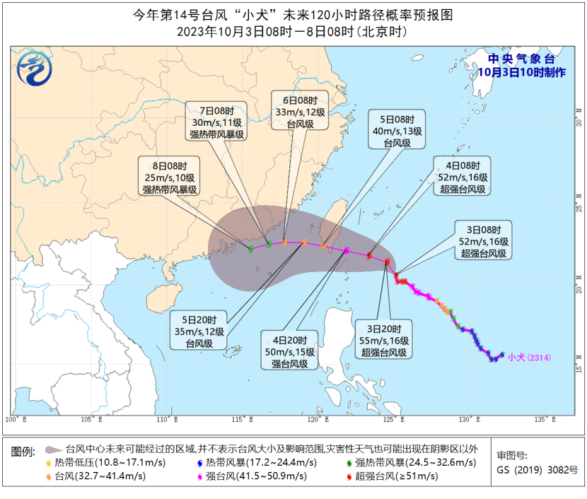 预计,“小犬”将以每小时10-15公里的速度向西北方向移动,逐渐向台湾岛南部沿海靠近,强度变化不大,4日夜间至5日早晨将登陆或擦过台湾岛南部沿海(强台风级,45-50米/秒,14-15级),之后向偏西方向移动,强度逐渐减弱。