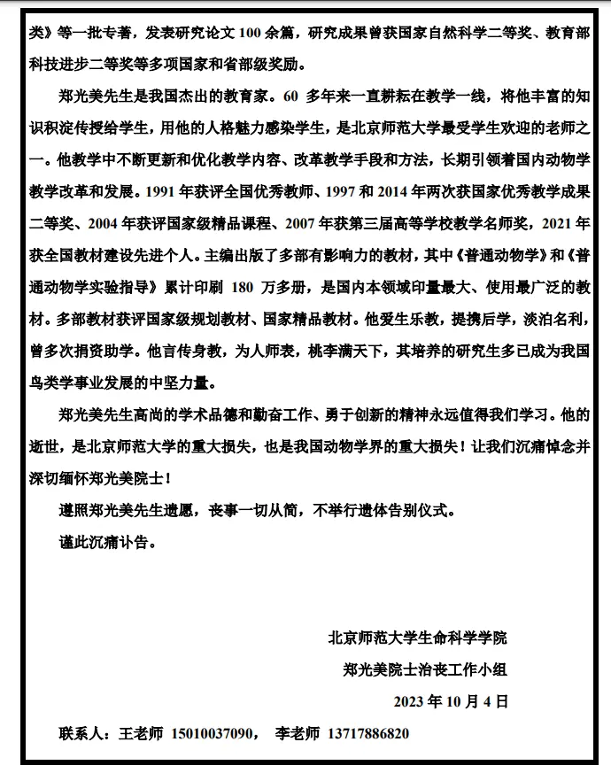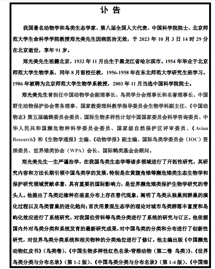 郑光美院士讣告