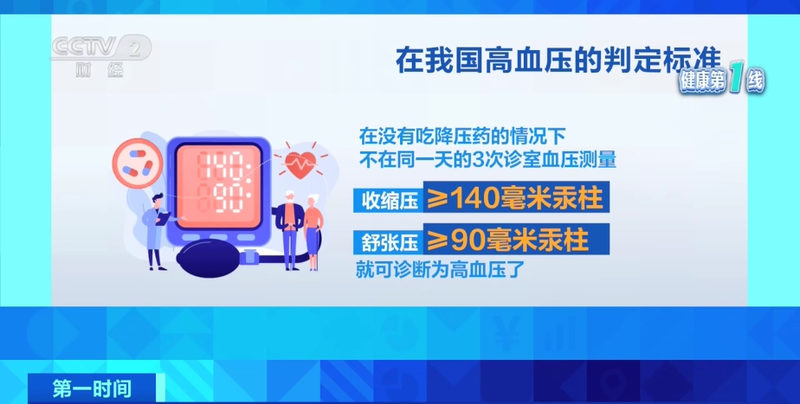在我国,高血压的判定标准为:在没有吃降压药的情况下,不在同一天的3次诊室血压测量,收缩压≥140毫米汞柱,或舒张压≥90毫米汞柱,就可诊断为高血压了。