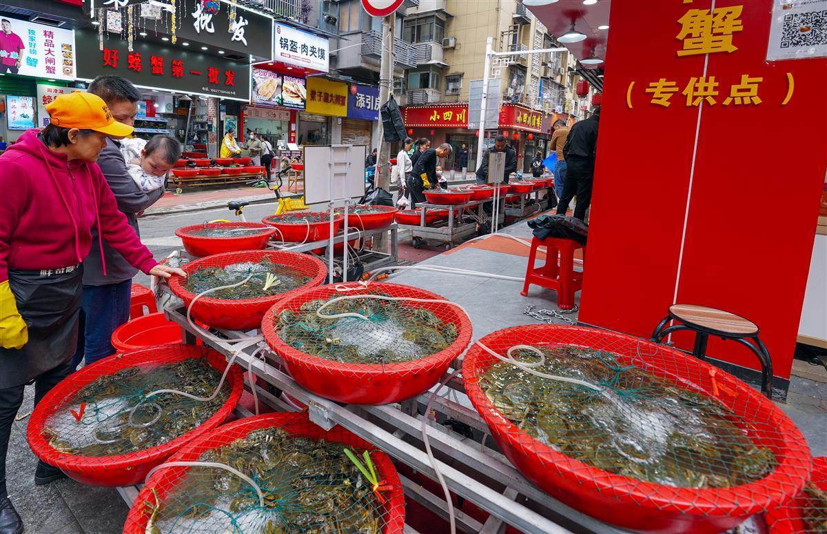 10月8日,武汉天气晴好,但温度走低,记者来到位于汉口利济北路的“螃蟹一条街”时,多家店铺的门口都挂出了促销的招牌,吸引路过的市民驻足挑选。