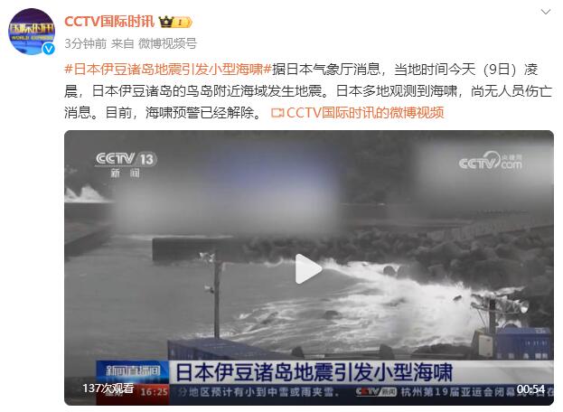 据@CCTV国际时讯 微博,据日本气象厅消息,当地时间今天(9日)凌晨,日本伊豆诸岛的鸟岛附近海域发生地震。日本多地观测到海啸,尚无人员伤亡消息。目前,海啸预警已经解除。