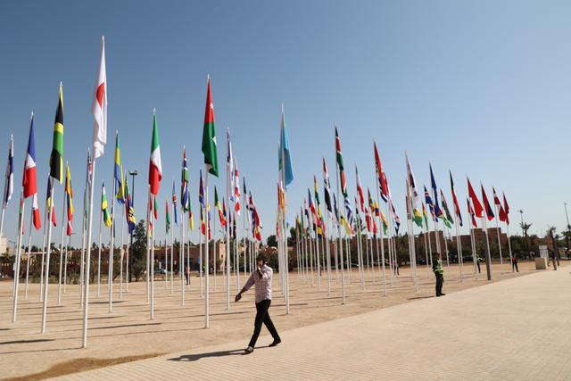 10月9日,在摩洛哥马拉喀什,一名参会者走过国际货币基金组织(IMF)和世界银行年会会场外的旗帜。新华社记者 霍晶 摄