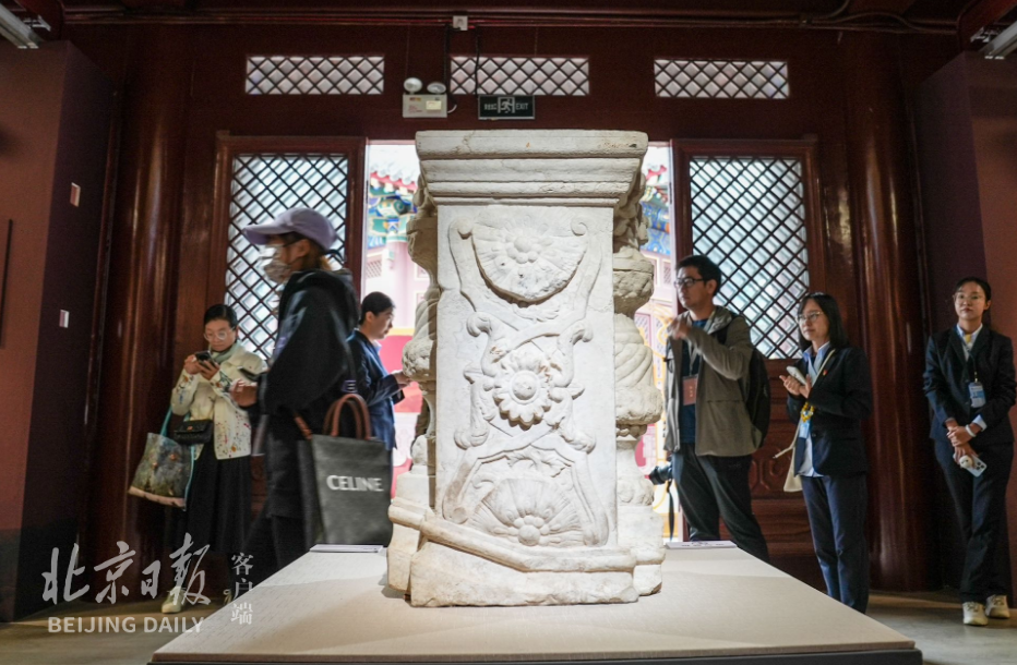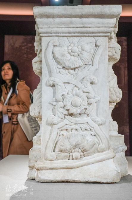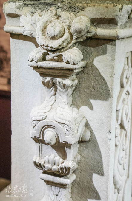 圆明园正觉寺内,走进“最上楼”一层,7根高约80至92厘米、有着精美雕花造型的汉白玉石柱成了展厅里最亮眼的明星。它们均来自圆明园西洋楼遗址区,仔细看,这些石柱正面纹饰以西式番花、贝壳纹等西洋雕花为主,侧面花瓶内花束则以具有吉祥寓意的牡丹、玉兰、荷花、菊花等中国传统花卉为主,圭角卷云纹、开窗的海棠线雕刻方式等亦与中国古建望柱、栏板相同,体现了中西合璧的文化内涵。