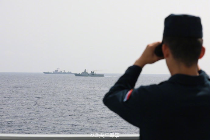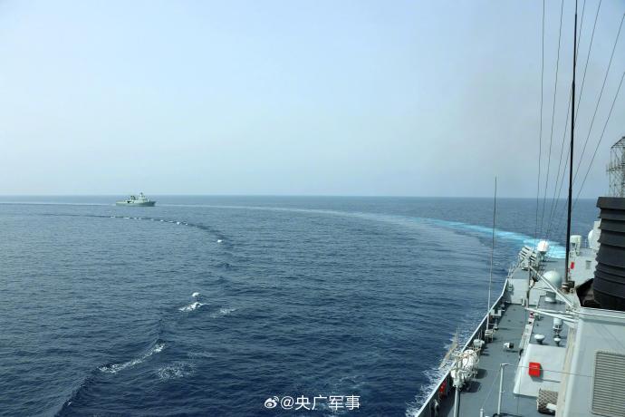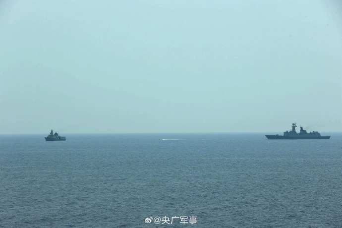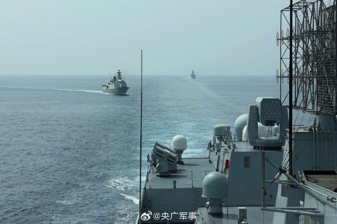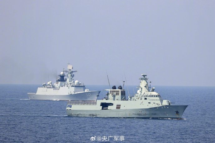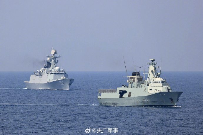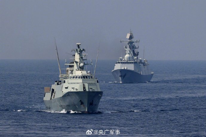 当地时间10月14日,中国海军第44批护航编队导弹驱逐舰淄博舰、导弹护卫舰荆州舰在马斯喀特附近海域,与阿曼皇家海军舰艇“萨达”号巡逻舰围绕海上通信和编队运动等科目进行了海上联合演练。