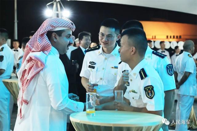 ▲甲板招待会上,中阿官兵代表共叙友谊。姜霞 摄