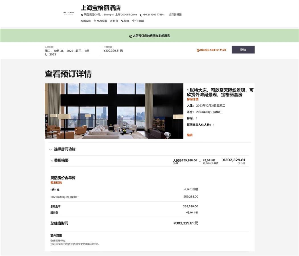 上海宝格丽酒店10月31日最高价格房型(来源宝格丽酒店及度假村官网)