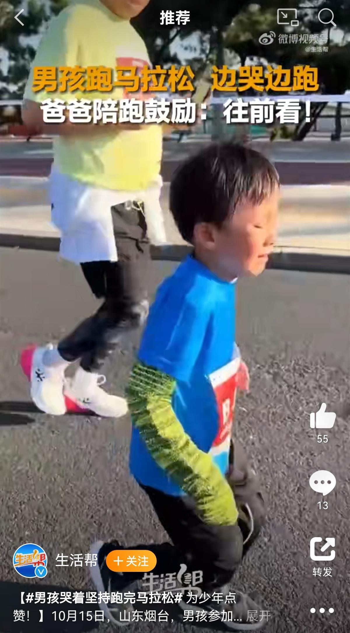 据山东电视生活帮栏目报道:10月15日,山东烟台,男孩参加马拉松,边哭边坚持跑。爸爸在身边陪跑鼓励,附近的跑友也为他加油。最终,男孩完成比赛。