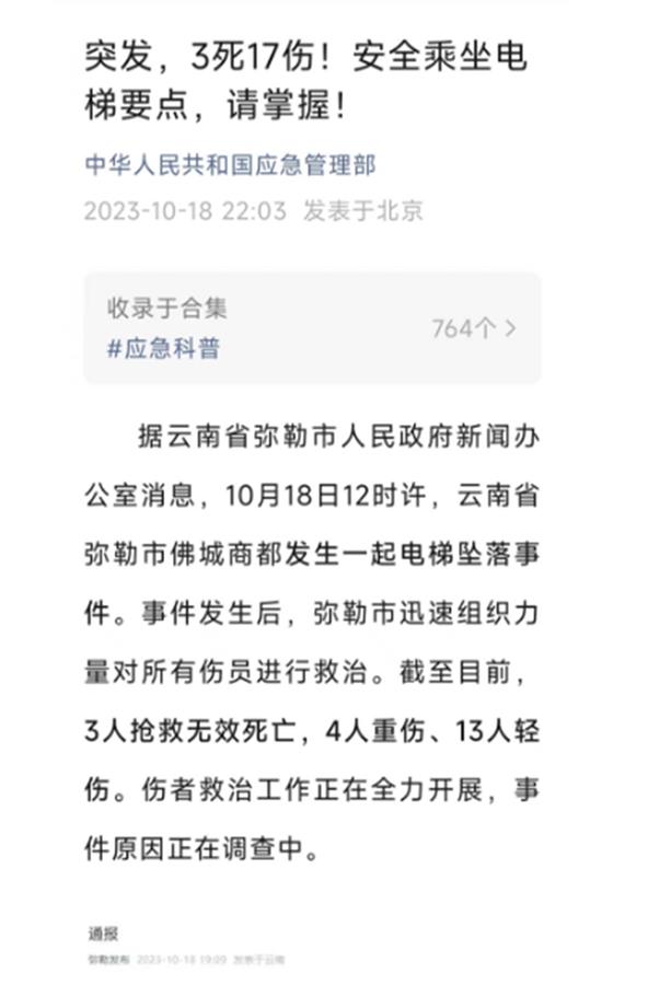 据“弥勒发布”官方微信消息,10月18日12时许,弥勒市佛城商都发生一起电梯坠落事件。事件发生后,弥勒市迅速组织力量对所有伤员进行救治。截至目前,3人抢救无效死亡,4人重伤、13人轻伤。伤者救治工作正在全力开展,事件原因正在调查中。极目新闻记者从红河州权威部门处获悉,涉事电梯系货梯,荷载三吨,事发时从二楼直接坠落到负一楼,造成多名人员伤亡。该电梯最近一次检测时间在2023年5月,检测结果为合格。目前,国家市场监督管理总局以及应急部相关专家正在赶往现场,具体的事故原因还有待进一步调查。