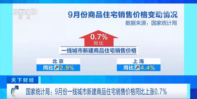 从同比看,9月份,一线城市新建商品住宅销售价格同比上涨0.7%,涨幅比上月扩大,其中北京和上海同比分别上涨2.9%和4.4%。一线城市二手住宅销售价格同比降幅收窄。