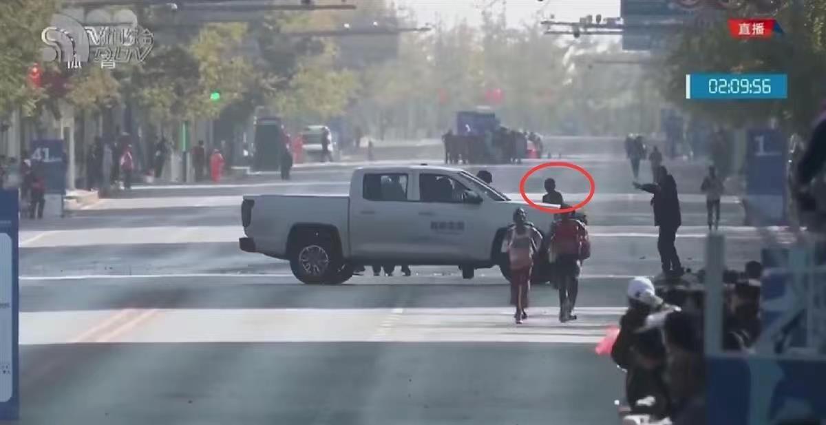 大连马拉松中国选手被车拦阻(图片来源:央视新闻)