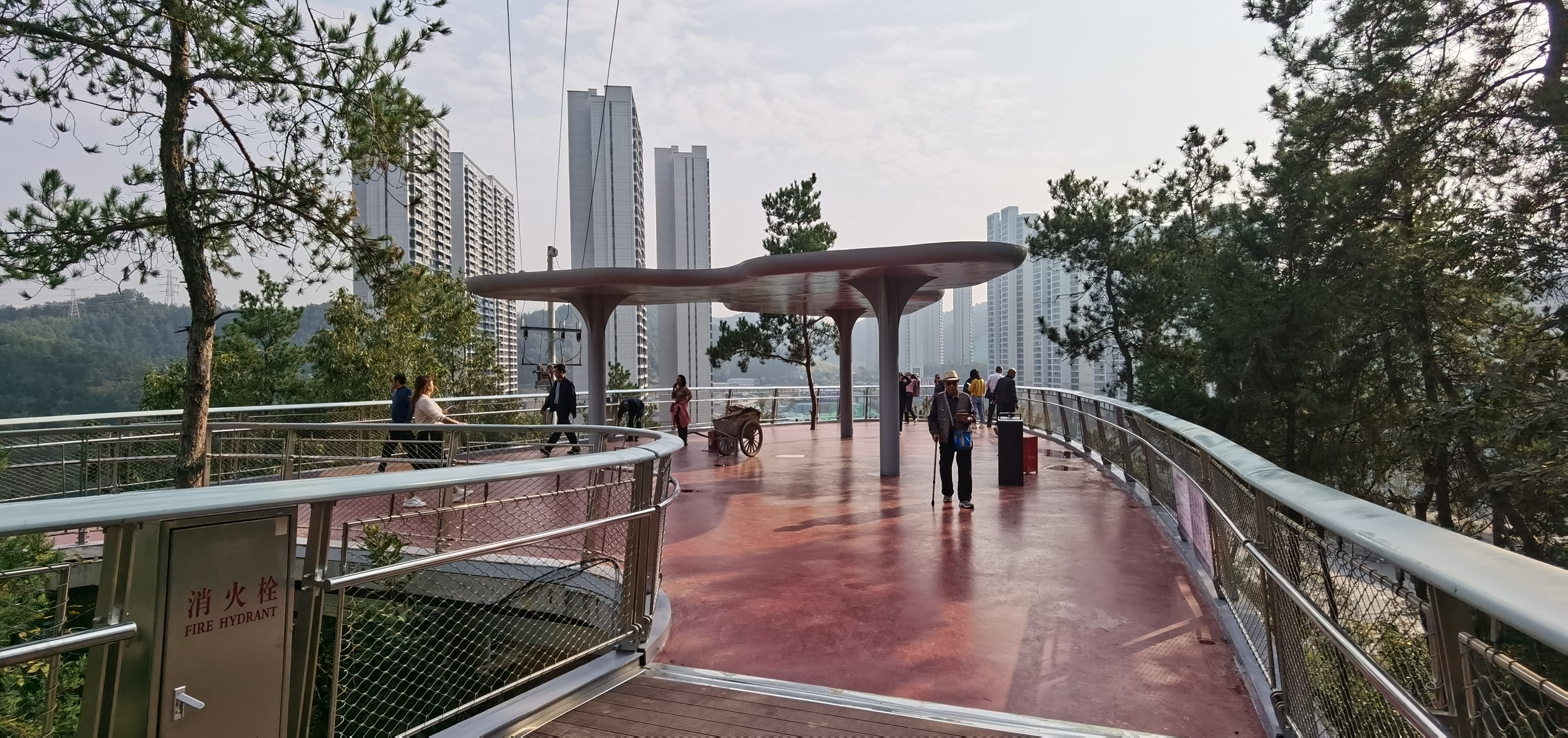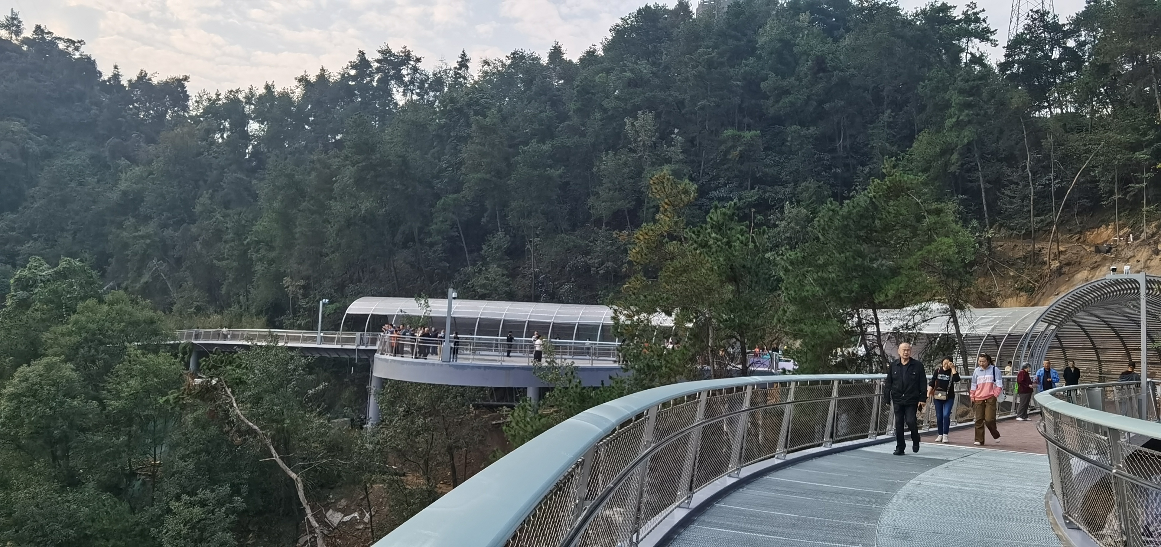 走在紫霄大道螺旋塔上,步道的坡度不超过15度,地面采用透水材料,两边护栏采用网状金属结构,整个步道色彩和谐,给人一种通透感。绕塔而上,回望步道九曲百转,似长龙、如彩带。
