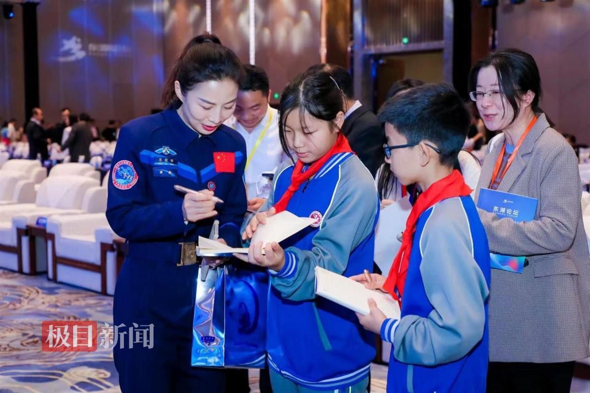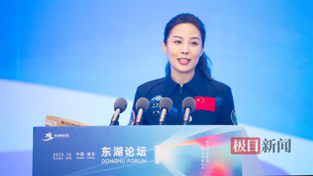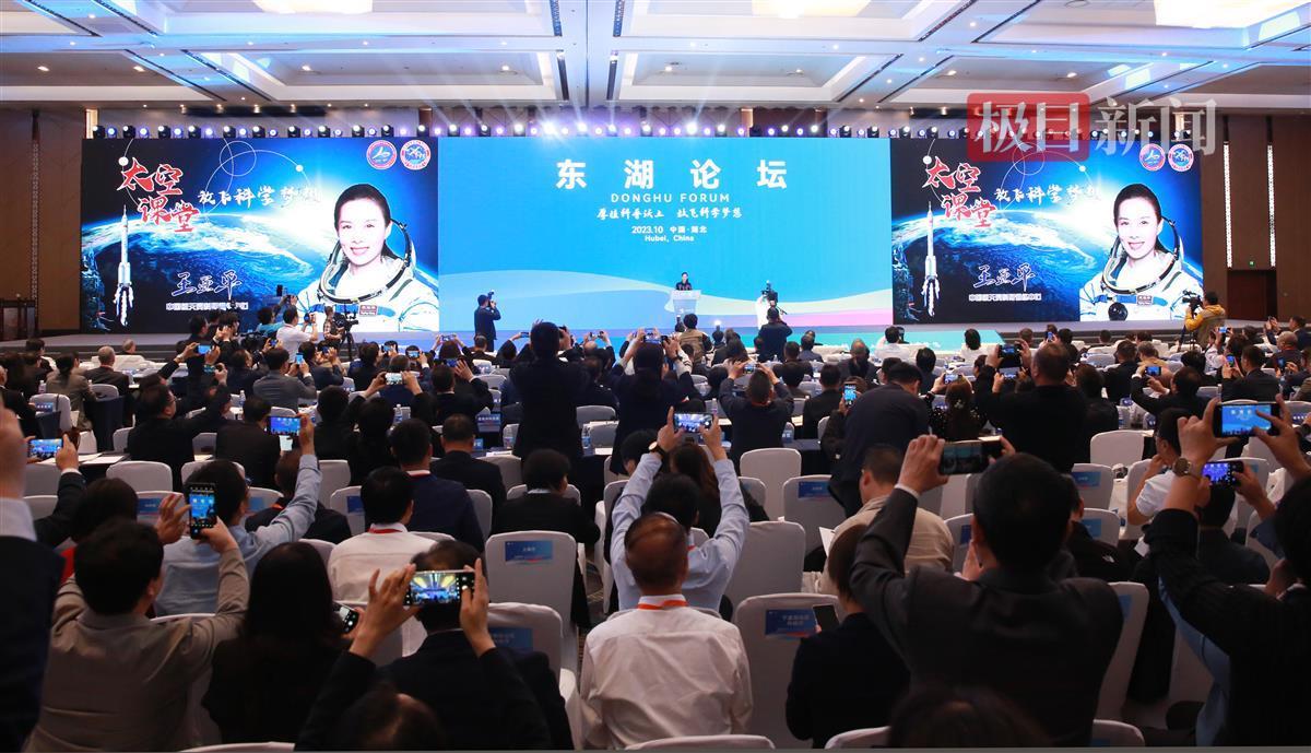 东湖论坛主论坛现场,英雄航天员、国家科普大使王亚平作了题为《太空课堂 放飞科学梦想》的报告,分享了她的飞天故事,重点通过太空授课的亲身经历,同与会人员一道感受科技发展对航天事业提供的强大动力。