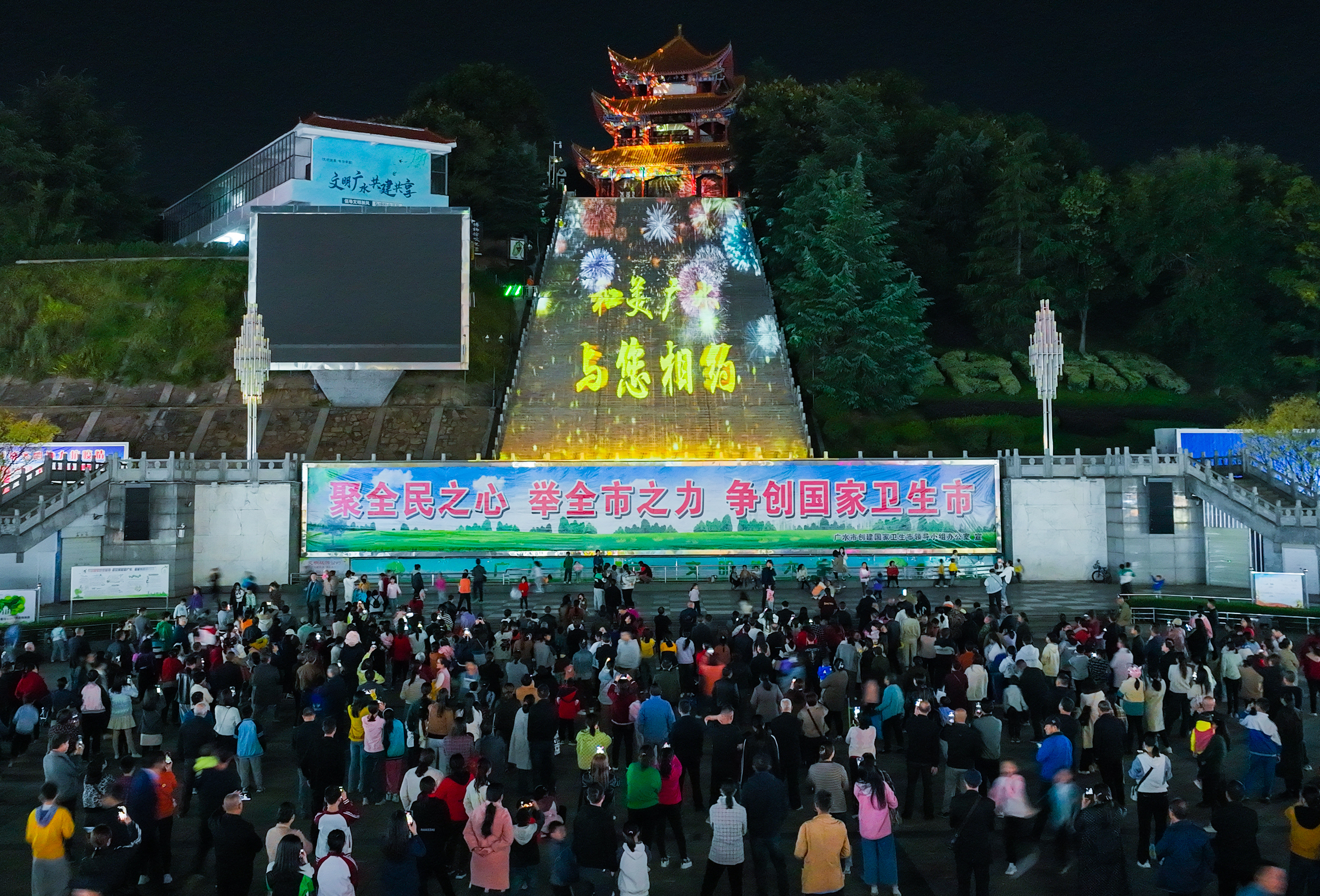 魁星楼下的台阶上,凤凰展翅,直冲魁星楼,飞向浩瀚星空。“应四面之重而为山,广八方之气而为水。秀美应山、诗画广水,等您赴约。”结束语响起,现场观众意犹未尽,久久不愿离去。