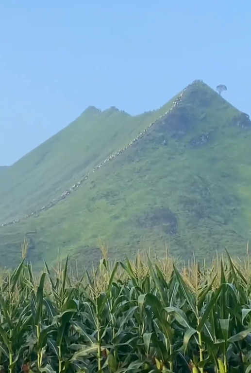 视频中,有人站在一片玉米地旁,远处是一座地势险峻的山体。从山脚到山顶是一道直的陡坡,山顶还有一道长长的山脊线。远远望去,陡坡和山脊线上似乎有一条白线。镜头拉近一看,原来是这是一条登山线路,整条线路上密密麻麻全是人。有网友评论称:“看上去就像蚂蚁搬家一样。”