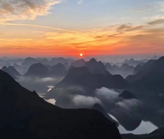 广西文化和旅游厅近日发微博称,剑龙山是这一带的最高峰,山脊起伏,恰似剑龙的脊背。登顶剑龙山,极目远眺,四周田野碧绿,道路如丝如线,山脚下的村庄如星罗密布,山上风光令人如痴如醉。特别是日出时分,朝霞将东方大海波涛一样的山峦染红,天开地阔,景色壮丽,令人迷恋。