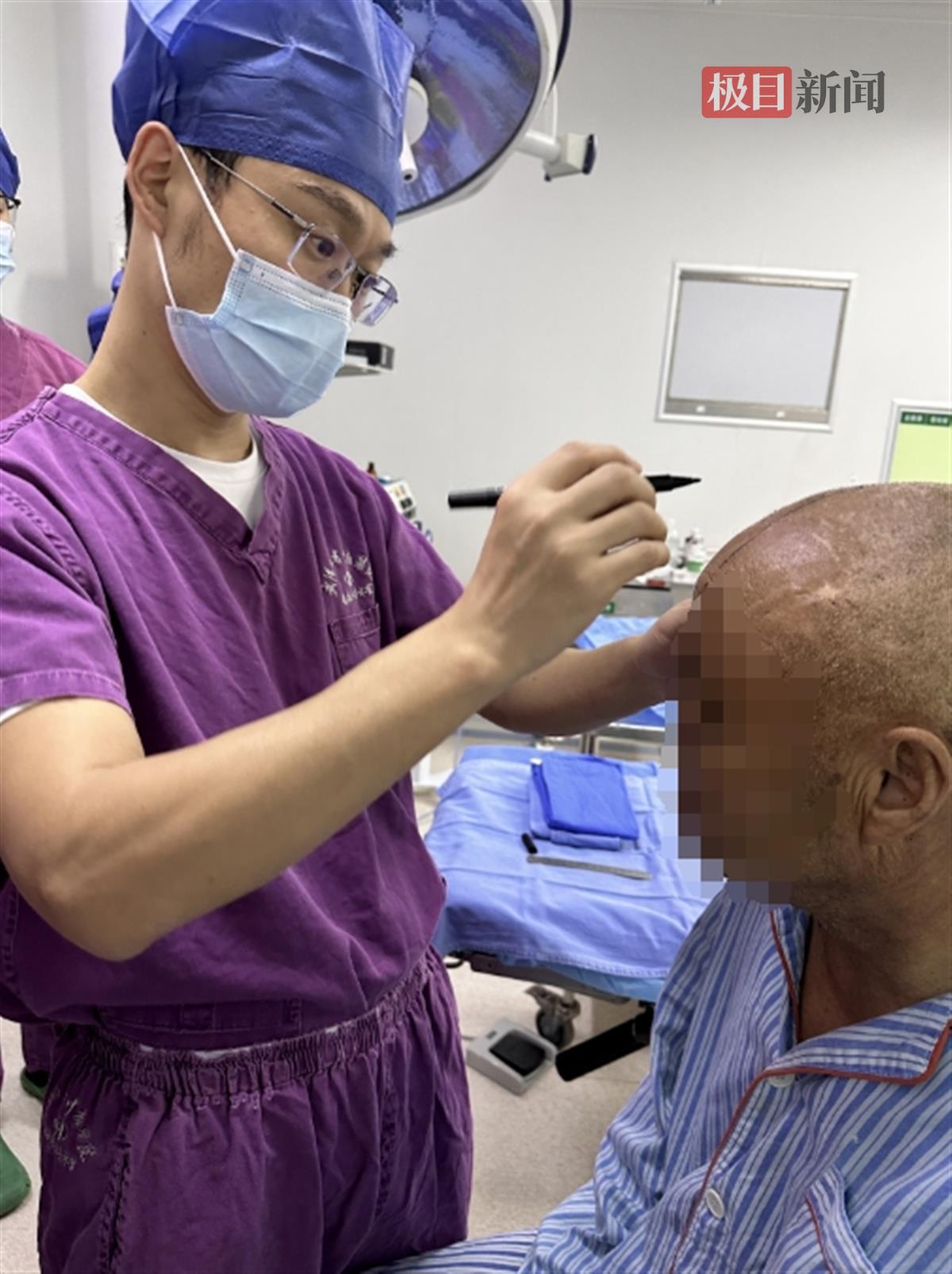 郭亮介绍,何爹爹由于外伤造成的鼻部及唇部缺损严重,两个部位都需要进行再造手术,手术共分为四期,二期手术在4个月后进行唇部修复,手术利用皮瓣转位来修复唇部缺损,同时会在额部预埋扩张器,为三期的鼻部再造手术做准备。再经过约5个月的时间,可进行第三期鼻再造手术,手术将额部扩张器取出,用额部扩张的皮瓣及肋软骨联合进行全鼻再造。术后三周进行第四期手术,将额部转下来的皮瓣断蒂处理。以上四期手术可完成对面部缺损部位的全部修复。