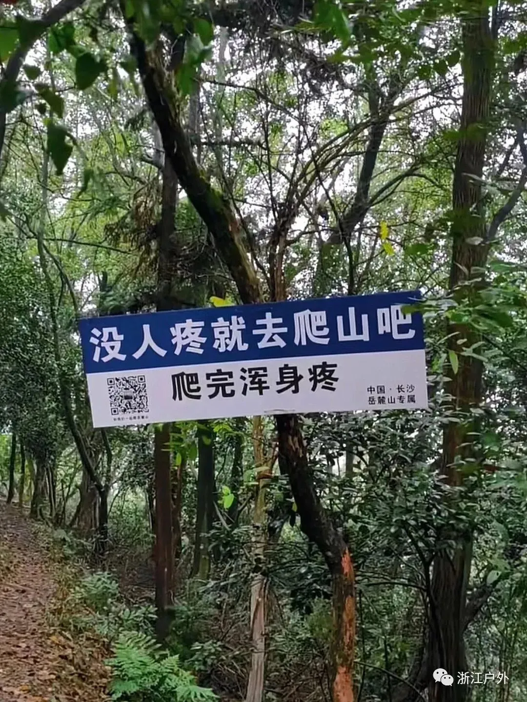 从岳麓山西门进入,行走十余分钟,就可以在道路的一旁发现一块立着的标语牌——“没人疼就去爬山吧,爬完浑身疼”。