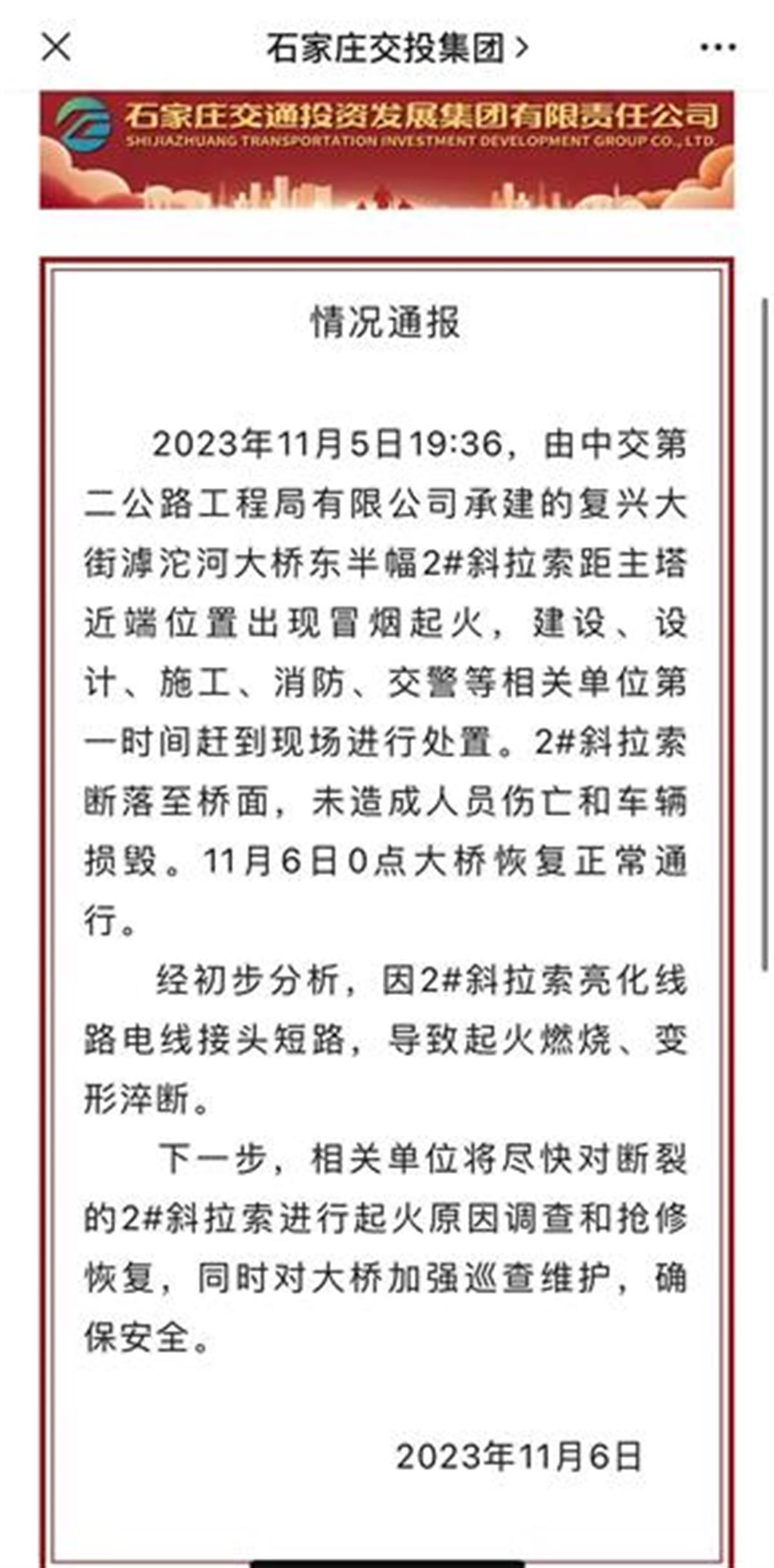 6日,石家庄交投集团发布通报称,5日19时36分,由中交第二公路工程局有限公司承建的复兴大街滹沱河大桥东半幅2#斜拉索距主塔近端位置出现冒烟起火,建设、设计、施工、消防、交警等相关单位第一时间赶到现场进行处置。2#斜拉索断落至桥面,未造成人员伤亡和车辆损毁。6日0时,大桥恢复正常通行。经初步分析,因2#斜拉索亮化线路电线接头短路,导致起火燃烧、变形淬断。下一步,相关单位将尽快对断裂的斜拉索进行起火原因调查和抢修恢复,同时对大桥加强巡查维护,确保安全。