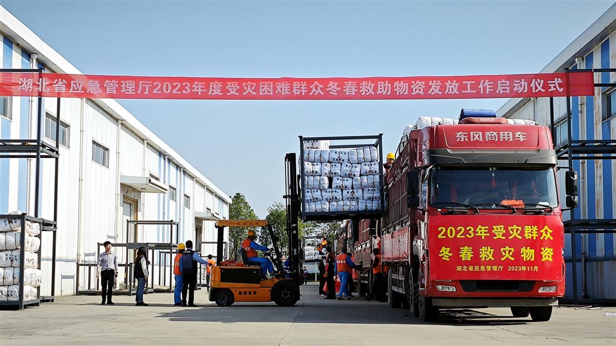 11月8日,几十辆满载救灾物资的卡车从中央救灾物资武汉储备库和宜昌、黄冈、咸宁、恩施、十堰、荆州、襄阳等7个省级救灾物资储备库驶出,17万件省级救灾物资启运,保障受灾困难群众温暖过冬。