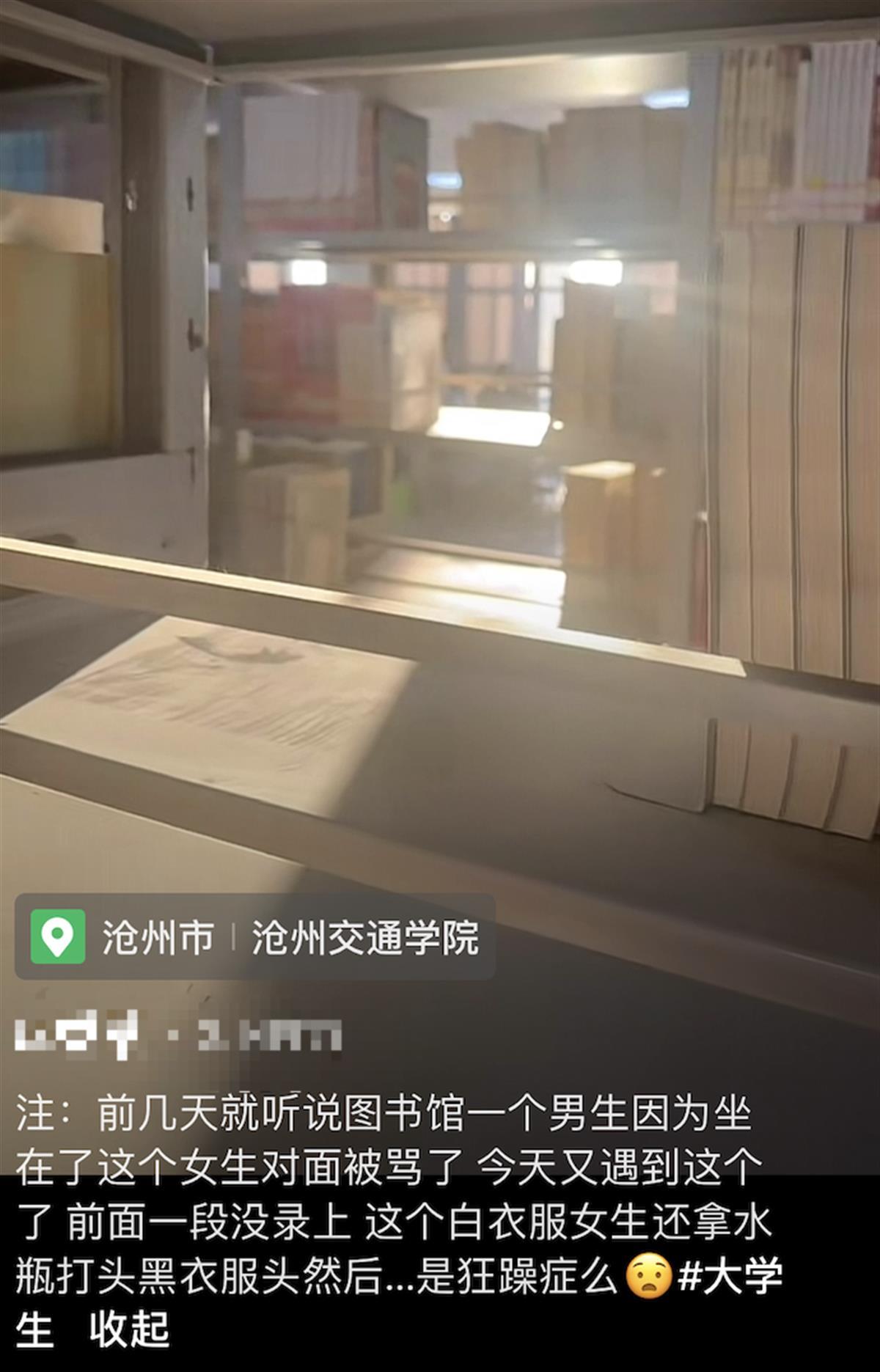 有学生爆料称,事发地位于沧州交通学院图书馆内,上述白衣女生还曾用水瓶打这名穿黑衣女同学的头。此前几天,也有一个男生因为坐在她的对面而被骂。