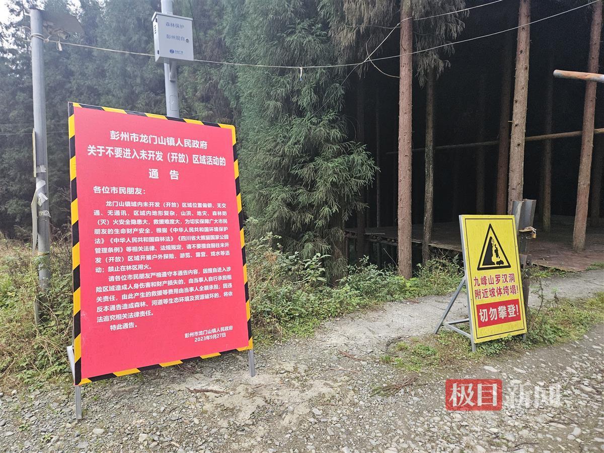 记者看到,现场设有摄像头,还立有多个告示牌。其中最新一份告示为《关于不要进入未开发(开放)区域活动的通告》,通告写道,由于龙门山镇域内未开发区域地形复杂、山洪、地灾、森林防火安全隐患大,救援难度大,希望游客不要擅自前往未开发区域开展户外探险、游览、露营、戏水等活动,因擅自进入涉险区域造成人身伤害和财产损失的,由当事人自行承担相关责任,由此产生的救援费用由当事人全额承担。落款为龙门山镇政府,时间为2023年9月27日。