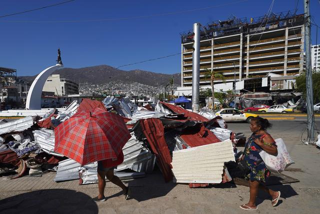 11月12日,在墨西哥阿卡普尔科,人们从飓风损毁的建筑残骸前走过。新华社/法新