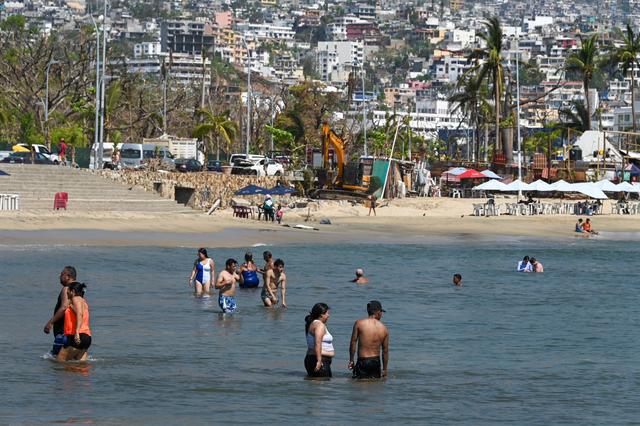 11月12日,在墨西哥阿卡普尔科,人们清理海滩上的杂物。新华社/法新