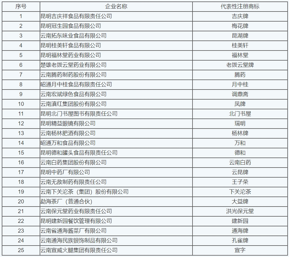 记者通过商务部中华老字号信息管理系统查询得知,目前,被列入中华老字号的云南商标有25个,分别是: