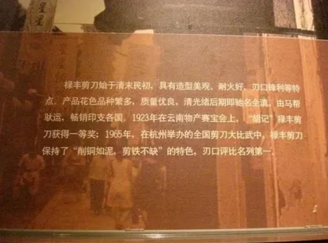 1923年,当时的云南督军唐继尧在昆明举办云南物产赛宝会,“胡记”剪刀获奖。自此,“禄丰剪刀”享誉云南全境。