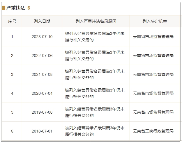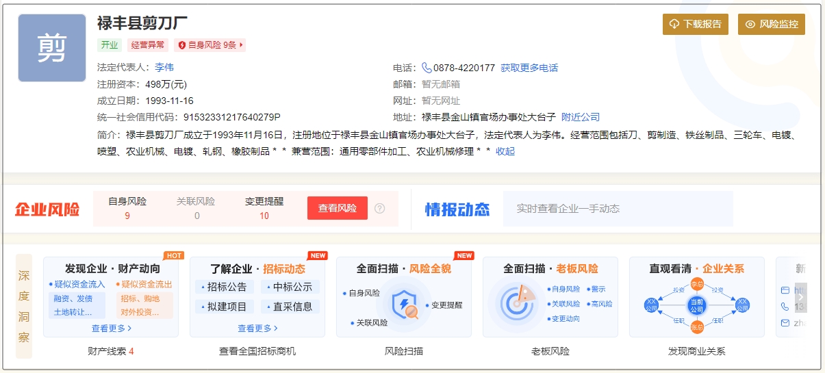 在企业信息查询平台爱企查,禄丰剪刀厂的信息下有“经营异常”“自身风险”等提示:因“未依照规定的期限公示年度报告”被禄丰市市场监督管理局多次列入“经营异常名录”,因“被列入经营异常名录届满3年仍未履行相关义务”被云南省市场监督管理局列入“严重违法名录”。