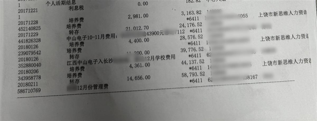 极目新闻记者获取的部分银行流水显示,从2017年开始,有上饶市新思维人力资源有限公司、芜湖鑫仁人力资源管理有限公司向一位户主为黄某的银行账户转款,备注为用工企业支付的培养费用,金额从数千元到数万元不等。张老师在接受蔡先生面对面采访的报料视频中称,而这些培养费最终流向了其前妻颜某某的私人账户。