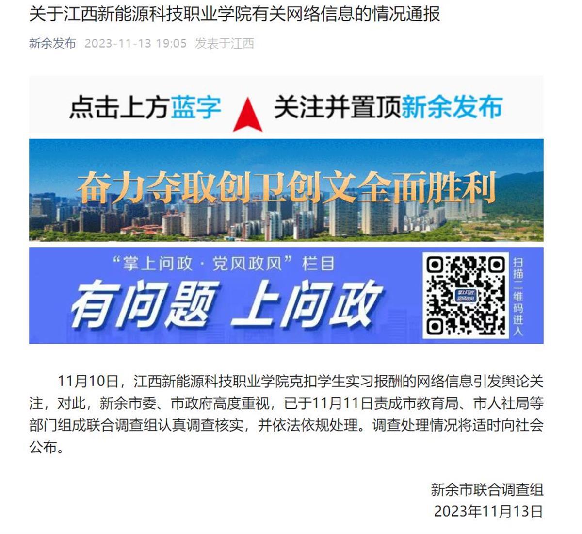 11月13日,针对王海举报问题,新余发布微信公众号消息称,11月10日,江西新能源科技职业学院克扣学生实习报酬的网络信息引发舆论关注,对此,新余市委、市政府高度重视,已于11月11日责成市教育局、市人社局等部门组成联合调查组认真调查核实,并依法依规处理。调查处理情况将适时向社会公布。