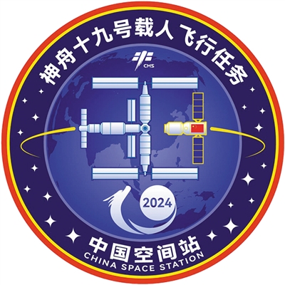 该方案标识是由中国空间站、神舟载人飞船、地球、星空等图案构成的一个红、黄、蓝配色的圆形标识。数字“19”融入中国龙的元素,舞动上升。周围的点点星辰共十九颗,对应神舟十九号载人飞行任务,共同体现我国航天事业的繁荣昌盛。