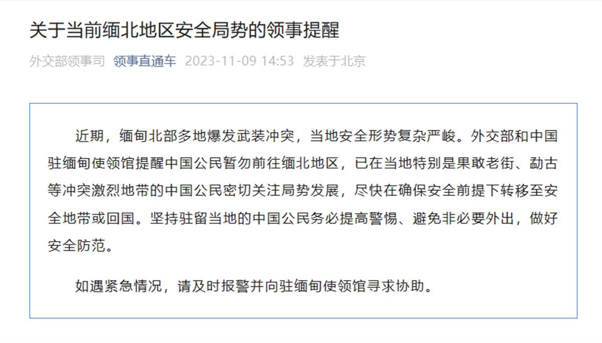记者注意到,11月9日,中国外交部领事司通过其微信公众号“领事直通车”发布《关于当前缅北地区安全局势的领事提醒》称,近期,缅甸北部多地爆发武装冲突,当地安全形势复杂严峻。外交部和中国驻缅甸使领馆提醒中国公民暂勿前往缅北地区,已在当地特别是果敢老街、勐古等冲突激烈地带的中国公民密切关注局势发展,尽快在确保安全前提下转移至安全地带或回国。坚持驻留当地的中国公民务必提高警惕、避免非必要外出,做好安全防范。如遇紧急情况,请及时报警并向驻缅甸使领馆寻求协助。
