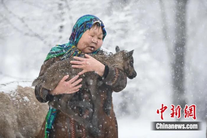 2023年5月1日,内蒙古大兴安岭,柳霞在雪中怀抱一头刚出生不久的驯鹿幼崽。王伟摄