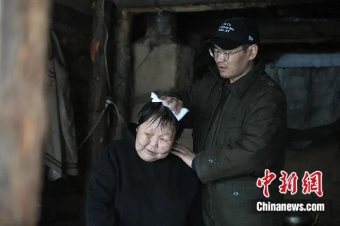 柳霞的儿子雨果为母亲擦拭被雪打湿的头发。王伟摄