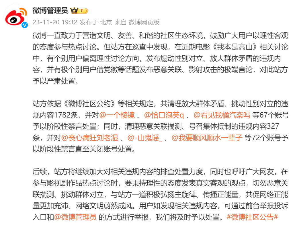 针对关于这部电影讨论中的部分极端言论,新浪微博社区管理官方微博@微博管理员11月20日晚发布微博社区公告称,“在近期电影《我本是高山》相关讨论中,有个别用户偏离理性讨论方向,发布煽动性别对立、放大群体矛盾的违规内容,并有极个别用户借党徽等话题发布恶意关联、影射攻击的极端言论,对此站方予以严肃处置。”