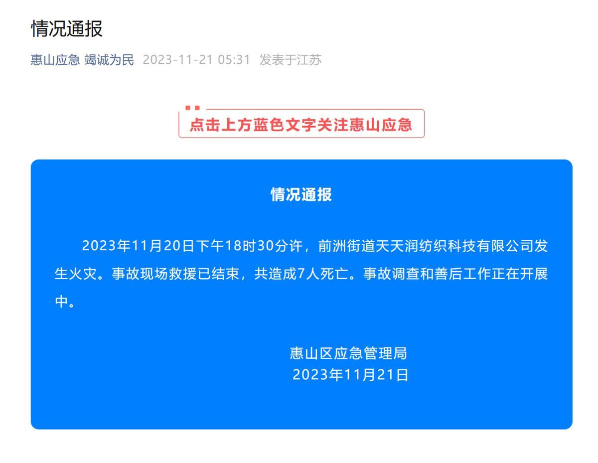 据无锡市惠山区应急管理局11月21日凌晨5时30分通报,2023年11月20日18时30分许,前洲街道天天润纺织科技有限公司发生火灾。事故现场救援已结束,共造成7人死亡。事故调查和善后工作正在开展中。
