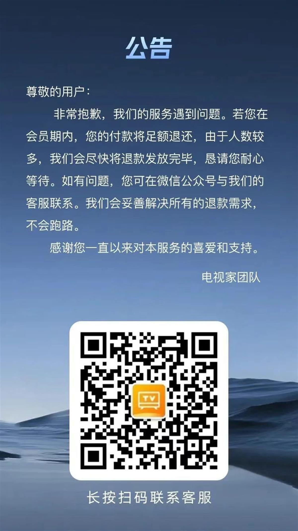 11月20日22时许,“电视家”官方微博和微信公众号先后发布公告:“尊敬的用户,非常抱歉,我们的服务遇到问题。若您在会员期内,您的付款将足额退还,由于人数较多,我们会尽快将退款发放完毕,恳请您耐心等待。如有问题,您可在微信公众号与我们的客服联系。我们会妥善解决所有的退款需求不会跑路,绝对不跑路!”