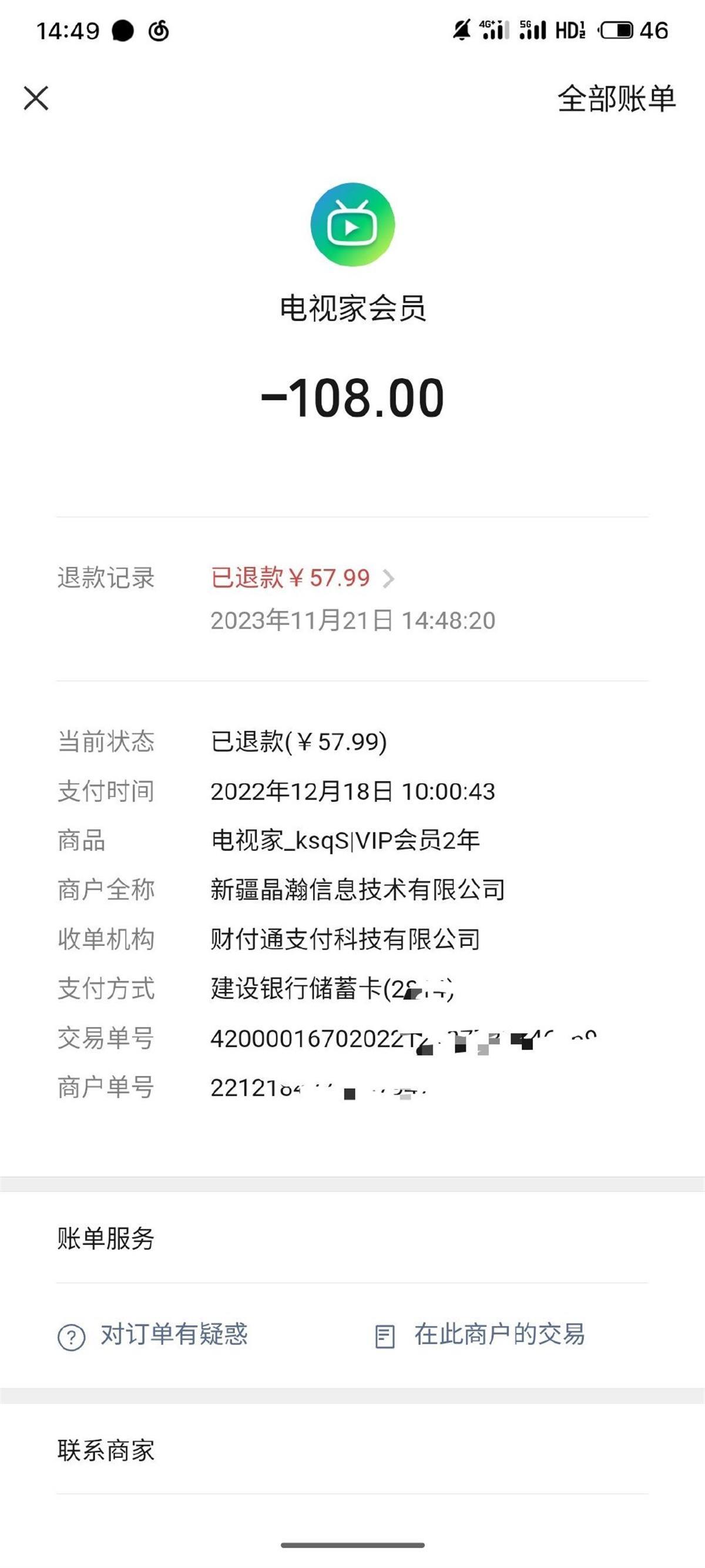 11月21日,极目新闻记者以用户身份致电“电视家”APP所属公司,相关工作人员表示,用户无需进行任何操作,系统会自动将充值款项退回。一年内刚充值的用户,退款速度会快一些,一年前充值的用户,他们的工作人员需要手动进行退款,速度相对就会慢一些。