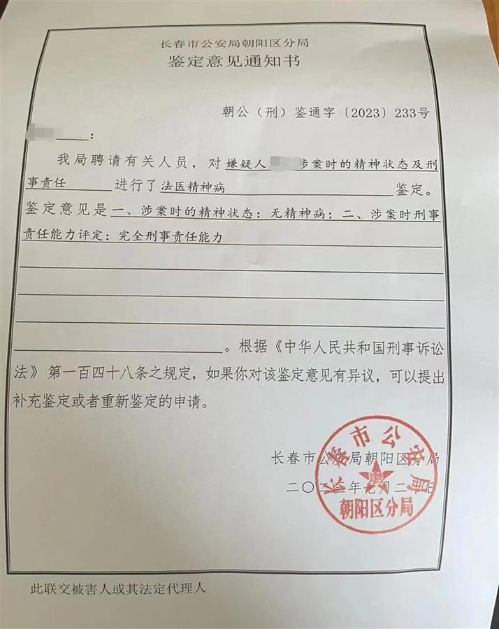 娄女士表示,事发后她曾去楼内探查,发现楼道内堆放了很多砖头、花盆等,且天台的门也没关。长春警方告诉她,嫌疑人是一名20多岁的外地男子,住楼上的日租房,没有固定工作。男子家属称其有精神疾病,但警方聘请有关人员鉴定显示,嫌疑人无精神疾病,具有完全刑事责任能力。