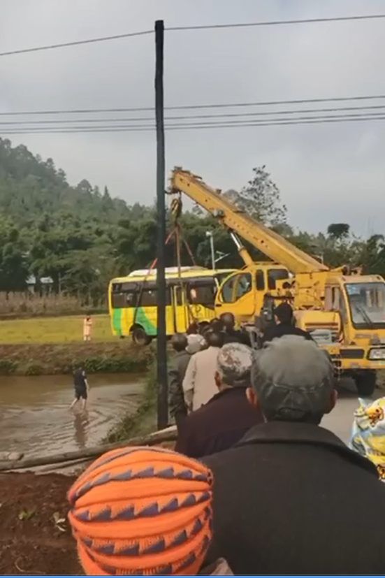 网传视频显示,在一处田野边的水塘里,一辆黄色公交车正被吊车缓缓吊起。水塘里站着一个裤管挽起的男子,水至小腿处。水塘边站着很多围观的群众。