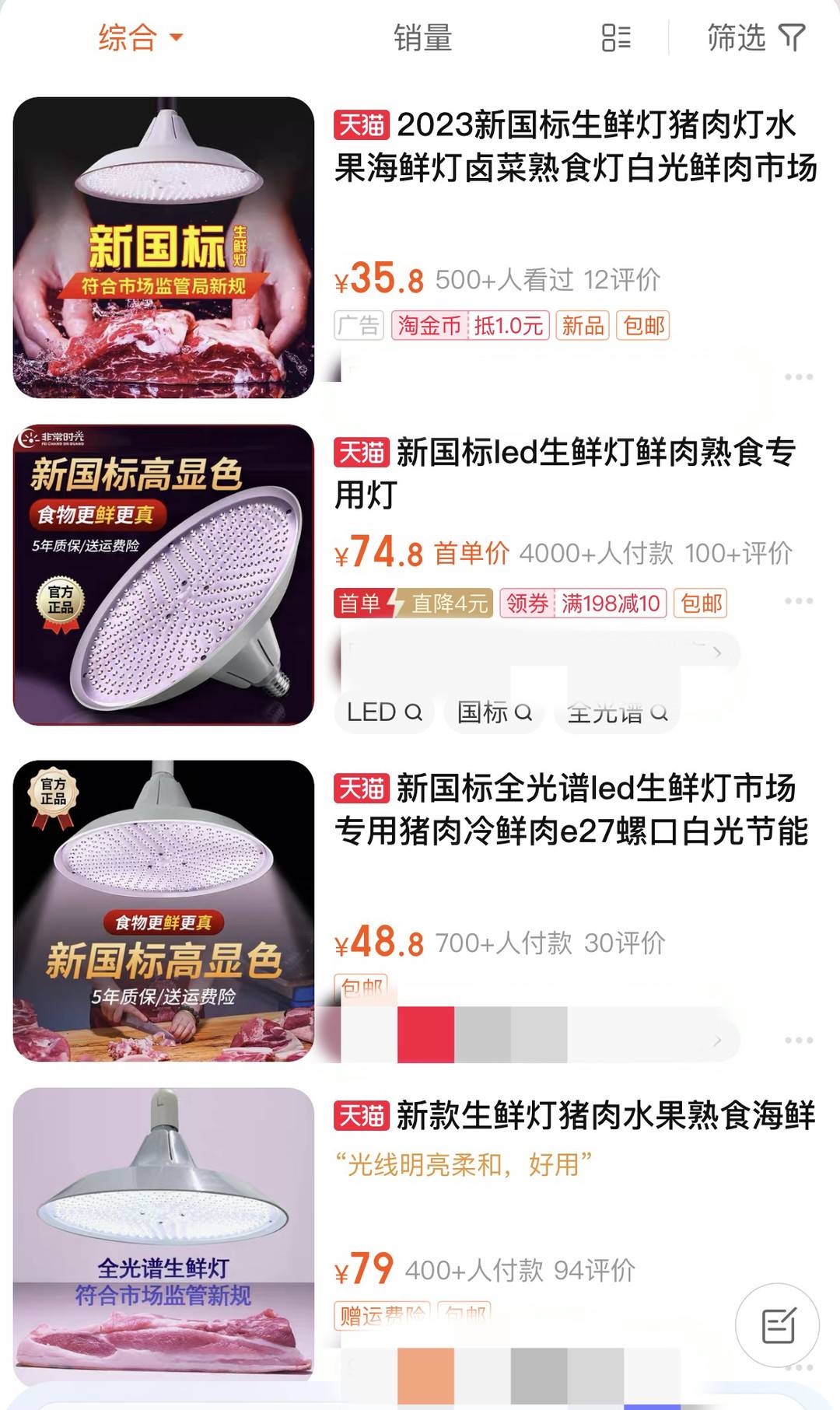 在线上,“生鲜灯”已“与时俱进”。记者在电商平台上搜索“生鲜灯”,依旧有大量产品,价格普遍在几十元到百元,销量在数百到上万不等,最高的一家“已售5万+”。记者注意到,商家们都在突出位置标注出“新国标”“符合市场监管新规”等字样。