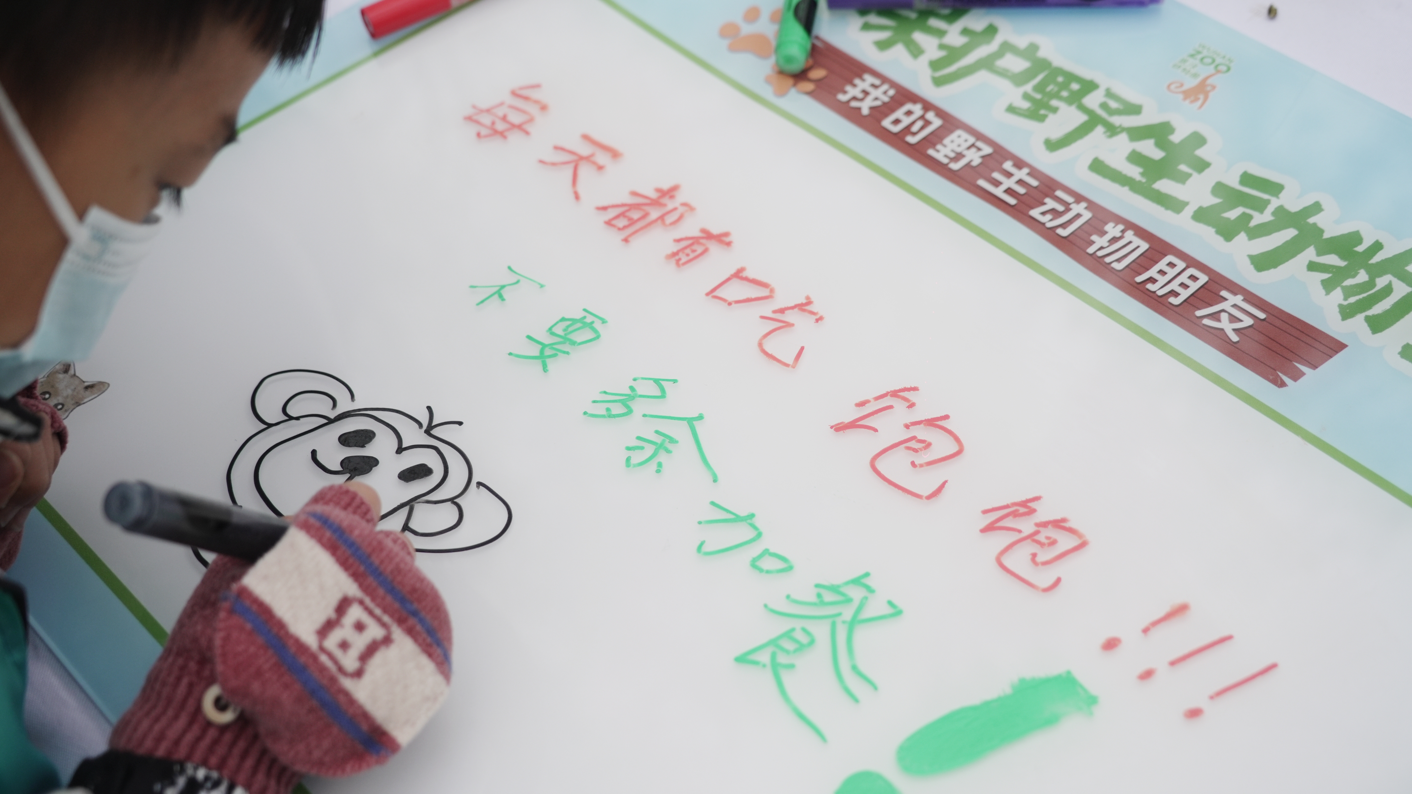“原来猴子吃不了太多香蕉,太甜,对它们不好。”来自华中里小学的张彦博在听课后画下了“禁止投喂”的科普提示牌,他希望大家不要投喂,也不要拍打玻璃,打扰动物们休息。