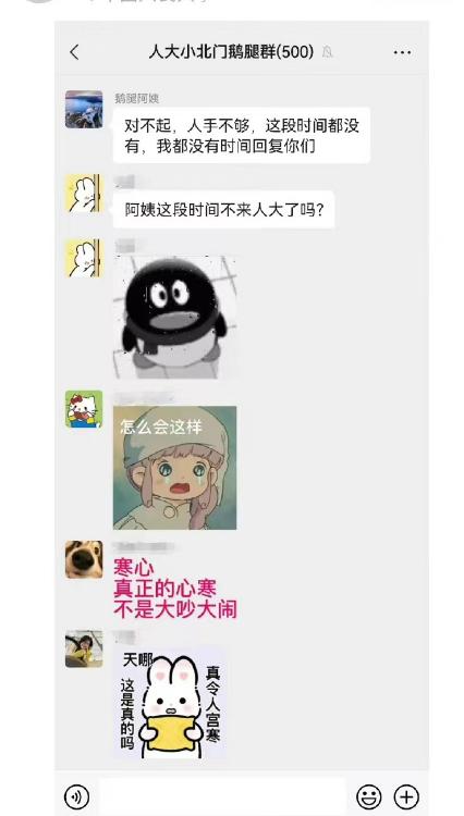 据媒体报道,鹅腿阿姨不太会用手机,线上十几个微信群都是学生帮她建的。阿姨最早在人民大学周边卖烤鹅腿,已经卖了将近两年。爆火出圈后,学生们不仅冒着零下几度的冷天线下排长队,微信群的“争抢大战”也愈发白热化。